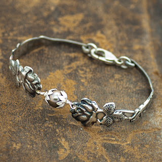 12. Armband av 4st skedblad med vackert växtmotiv tillsammans med mörka sötvattenspärlor. Förlängningskedja. Pris: 25€ |